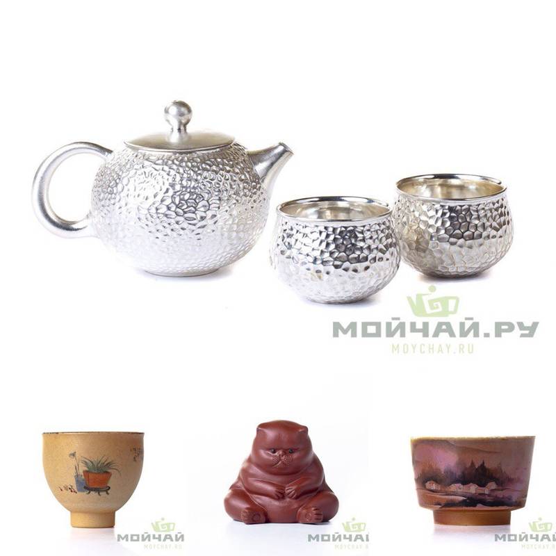 Уникальный Набор для чайной церемонии, состоящий из чайника и двух пиал из фарфора, выполненых в технике оборачивания серебром;